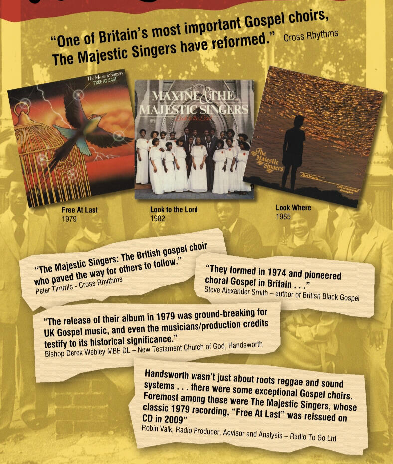 The Majestic Singers were one of the first black gospel groups in the United Kingdom, debuting in 1975 in their first concert at New Testament Church of God (Handsworth), Birmingham. When they started coming together as a group to minister all those years ago, they could not have imagined how far the Lord would take them.